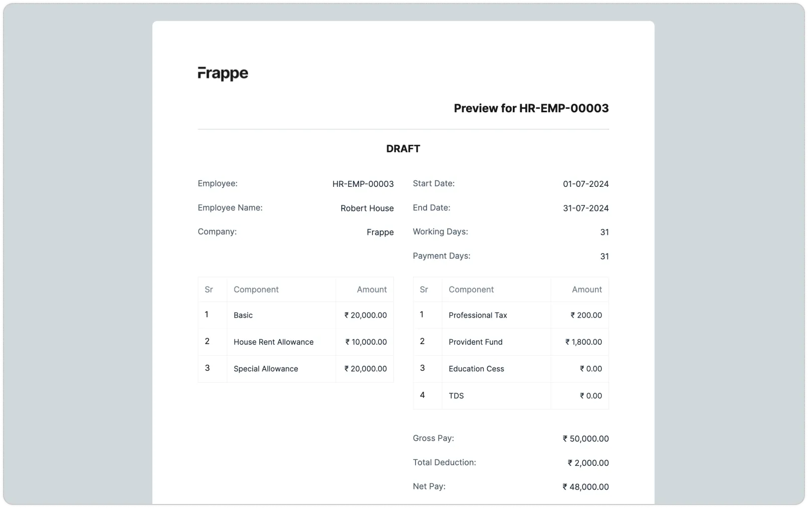 تسهل Frappe HR إدارة الرواتب من خلال دمج أنظمة الرواتب والحسابات لتوفير الوقت وتقليل الأخطاء. يمكن إنشاء هياكل رواتب معقدة بناءً على القواعد، مثل تحديد مكونات الأجور والخصومات، وتعيين هذه الهياكل بشكل جماعي للموظفين. كما يمكن معاينة كشوف الرواتب قبل تنفيذها لتجنب الأخطاء.